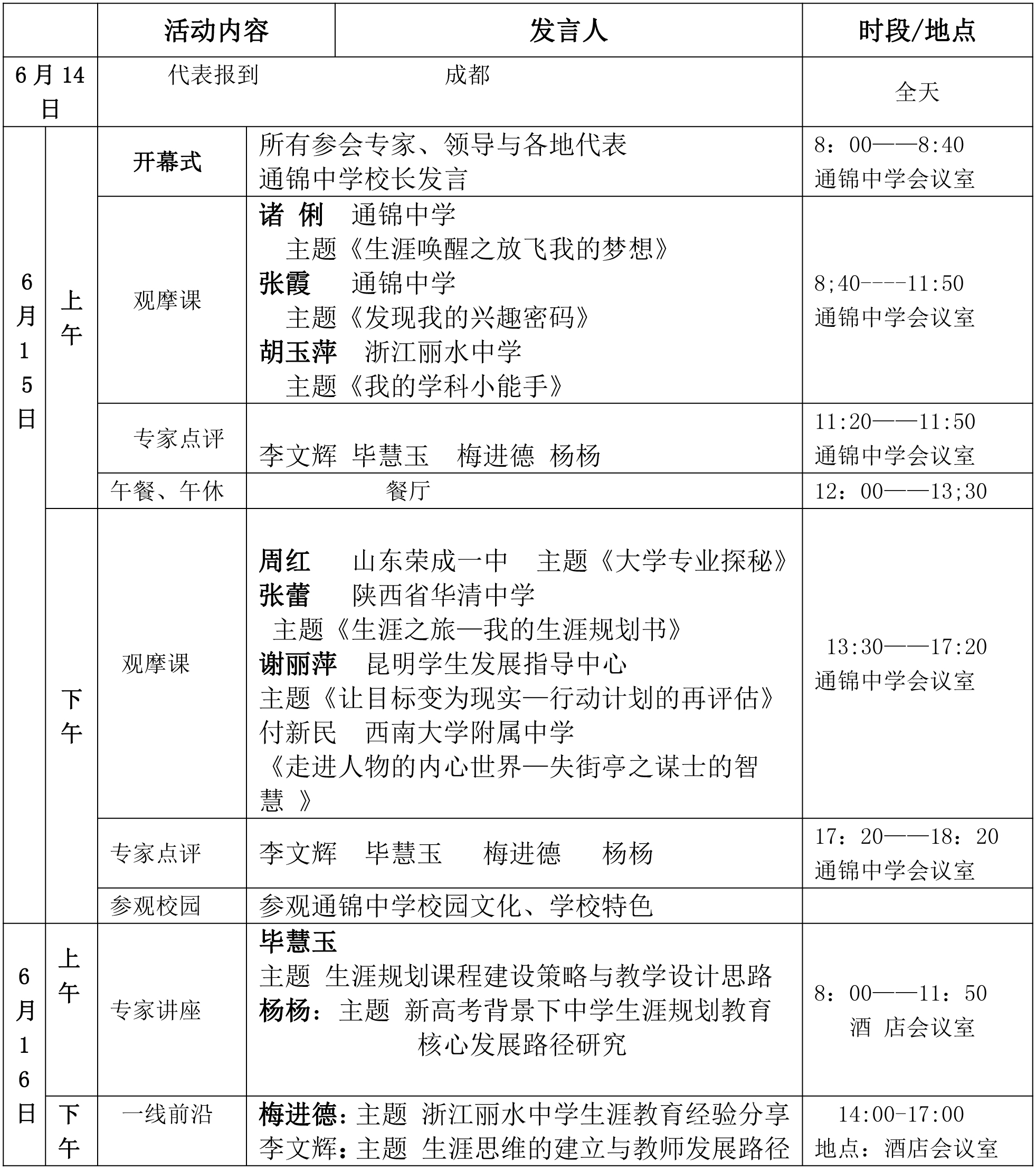 为贯彻新高考改革的选择性教育思想,促进学生全面而有个性的发展,加强对普通高中学生的学业、职业指导,提高学生综合素质,扎实的把生涯教学理念转化为教学行为,解决普通高中生涯规划教育遇到的实际问题。中国人生科学学会学生发展指导专业委员会、生涯规划教育与学生未来发展研究总课题组于2018年6月15日在成都市召开“全国首届高中生涯规划课教学设计研讨会”暨“成都市通锦中学生涯规划教育实践成果观摩会”。届时将邀请参会代表实地观摩成都市通锦中学生涯规划教育实践成果(生涯课堂、生涯课题研究思路、生涯文化、校园文化)。