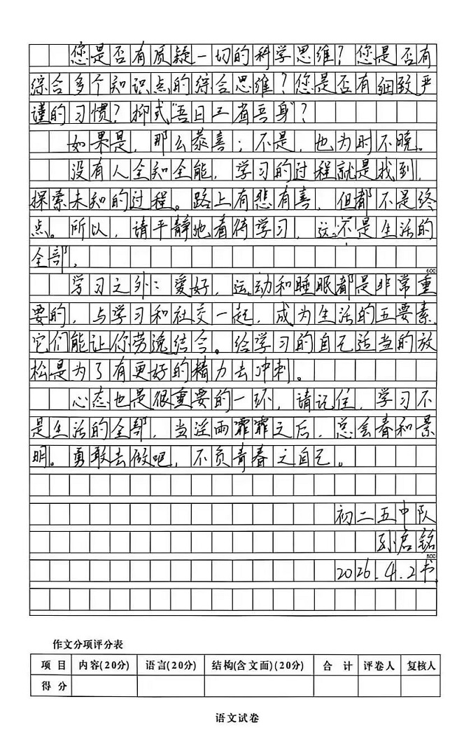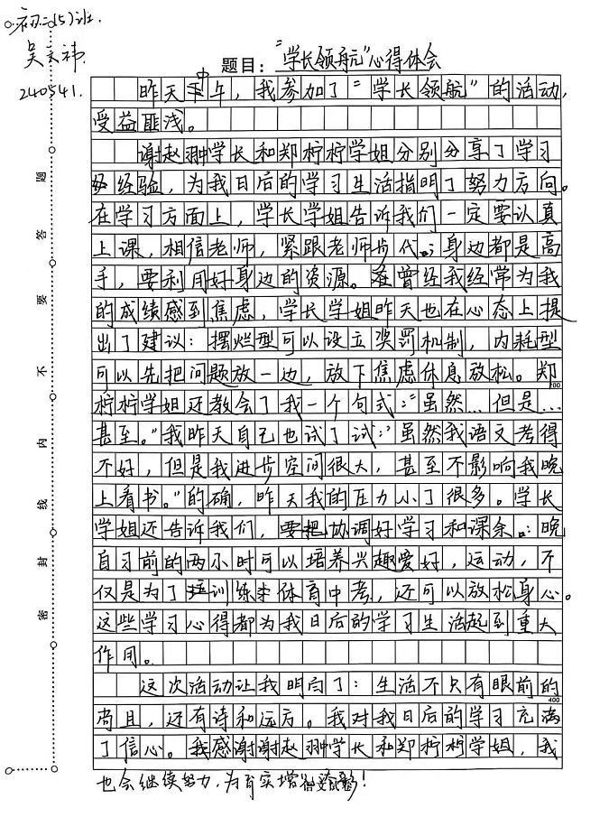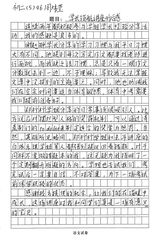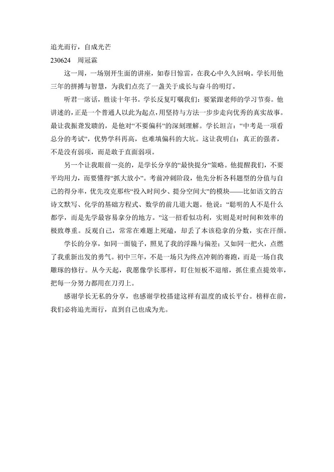 本次“生涯规划指导与励志教育——学长启航”讲座,为初中同学们带来了丰富的学习经验,为大家的学习道路指明了清晰的方向。也祝愿每一位初三学子都能带着这份宝贵的经验与温暖的力量,科学规划、高效学习、稳住心态、全力以赴,在2026年的盛夏,提笔时从容自信,合笔处如愿以偿,不负拼搏的汗水,不负青春的时光,圆梦中考!