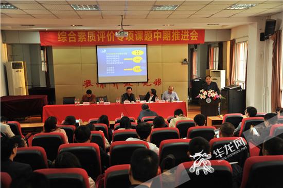 重庆市普通高中学生综合素质评价专项课题中期推进会上,40多所学校分为四组进行了研讨,各个学校都就其研究成果作了汇报。其研究各有侧重,有的结合学校特色教育,有的注重校本课程群建设,有的重视评价指标体系校本化。