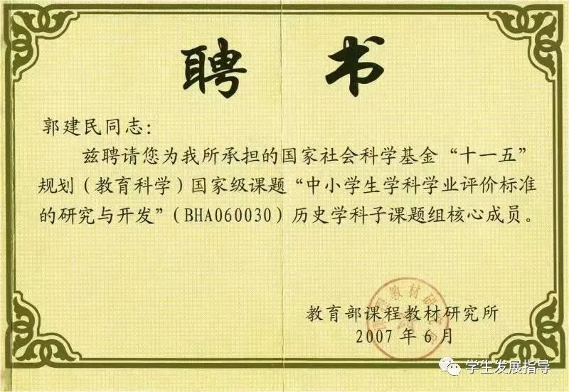 2007年担任教育部课程教材研究所,历史学科国家规划课题核心成员。2012年,在南昌举办的全国历史课堂教学大赛,指导的青年教师获全国历史教师一等奖。2016年在中国教育电视台《中国课堂》栏目,担任历史学科主讲专家之一。