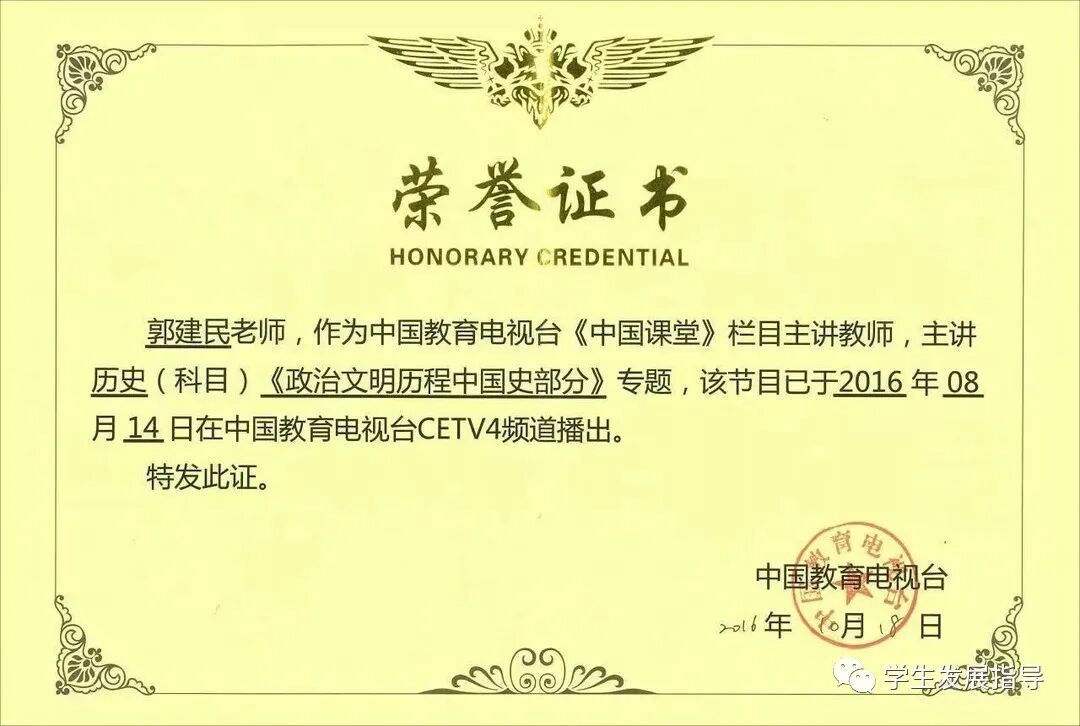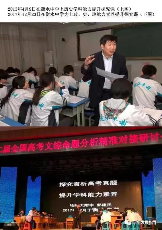 2011年在武汉全国历史年会上进行高中历史备考专题讲座,2016年在《历史教学》杂志主办的历史学科核心素养学术论坛上做典型发言、先后在成都七中、合肥一中、雅礼中学、衡水中学、西工大附中、黄冈中学等近百所名校上高三历史能力提升探究课、长期从事高校、高中衔接拔尖人才培养工作、曾任教育部阳光高考平台高考指导专家,曾被北大、南开、吉大聘为招生顾问。光明日报曾以“郭建民的教育歌剧”为题做过专题报道。